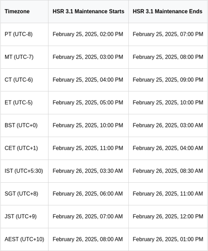 Based on the typical six-week update cycle, the expected release date and end time for HSR 3.1 are projected to follow this schedule: