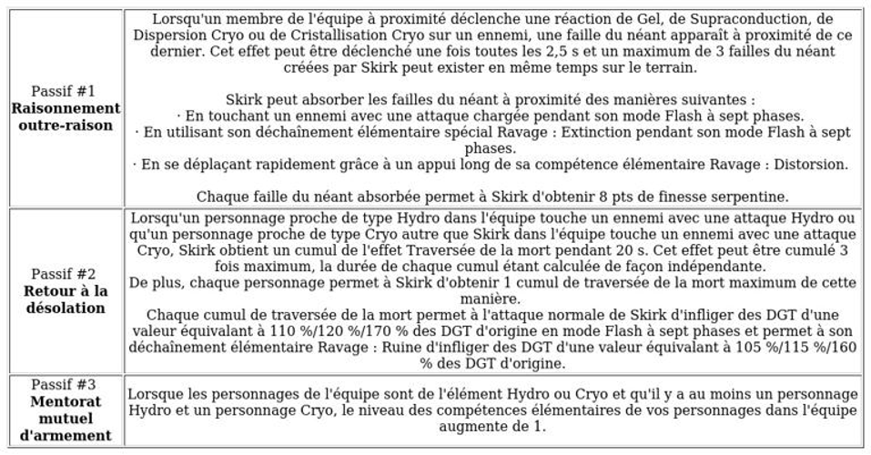 Contrairement à de nombreux personnages, Skirk n’utilise pas d’énergie élémentaire classique. Elle se sert plutôt de la finesse serpentine, une ressource qu’elle accumule par ses propres moyens. Son passif « raisonnement outre-raison » permet de générer une faille du néant chaque fois qu’une réaction cryo autre que la fonte est déclenchée, à un rythme maximal toutes les 2,5 secondes. Elle peut accumuler jusqu’à 3 failles simultanément. Ces failles du néant peuvent être exploitées par certaines de ses capacités pour lui conférer 8 points de finesse serpentine supplémentaires.