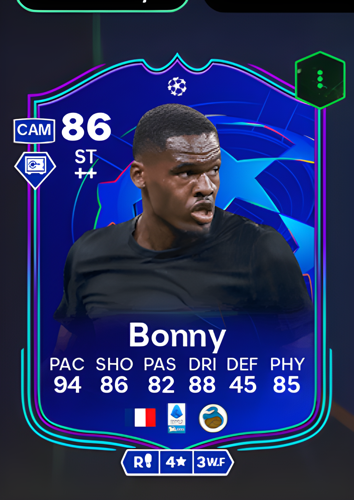 Yoan Bonny's UCL Primetime card stands out as a formidable Striker, boasting an impressive overall rating of 86. With a blistering pace of 94, sharp shooting at 86, and agile dribbling rated at 88, Bonny is well-equipped to lead the attack. His solid passing score of 82 and robust physicality at 85 further enhance his ability to create and convert opportunities in the final third, although his defensive rating of 45 highlights his focus on offensive play. As a striker, this card offers the advantage of quick, incisive runs behind the opposition, making Bonny a constant threat who can break down defenses and capitalize on scoring chances to secure victory.