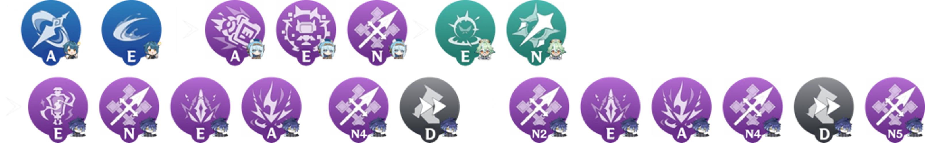 La rotation s'articule autour du temps de recharge de 16 secondes de la compétence de Flins. Certains supports s'adaptent avec des astuces : utiliser Furina une rotation sur deux, ou équiper Kokomi d'une arme rituelle R5.
