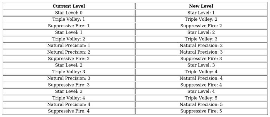 The subsequent column specifies the target level for advancement.