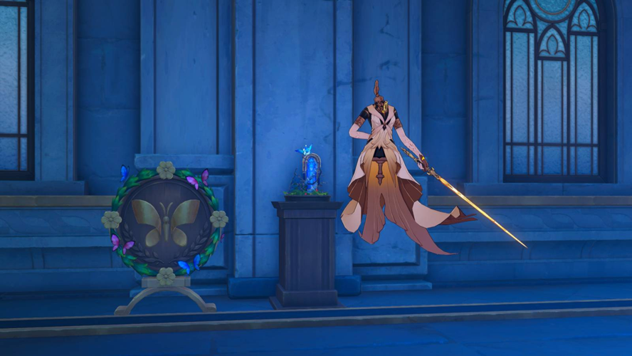 Leaving this area, teleport to the Royal Palace Ruins space anchor. Look northward to spot a high-speed flying amphora; use a long-range attack to break it open and claim the nymph perched atop. Next, head to the Treasure Vault Secret Passage space anchor and enter the western 3D room. Interact with the Butlerworm near the shelves to obtain another nymph.