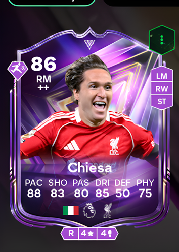 Federico Chiesa's FC Pro card is a formidable 86-rated Right Midfielder, boasting an impressive pace rating of 88, an 83 for shooting, 80 for passing, and 85 for dribbling, complemented by 75 physicality. This profile makes him a quintessential sharp attacking player on the wing, capable of using his blistering speed and elite dribbling to quickly tear apart the opposing team's defense. Once in dangerous areas, his reliable shooting and passing allow him to either seize the opportunity to score a decisive goal or create the final pass to seal the deal in the game.