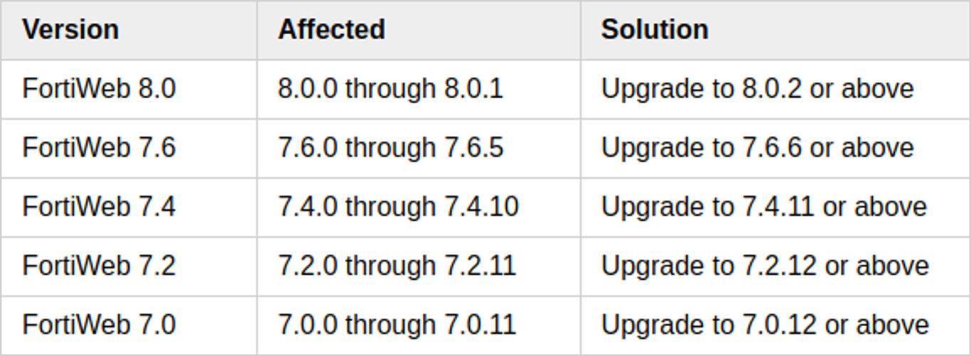 System administrators are strongly recommended to immediately deploy the latest software updates released today for their FortiWeb appliances to mitigate the risk of successful attacks targeting this security flaw.