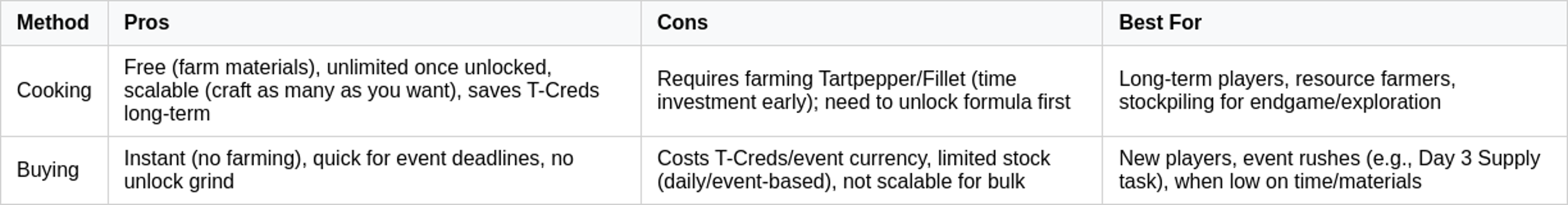 For those aiming for maximum efficiency, prioritize unlocking the meat stir-fry formula early. Focus on aggressively farming tartpepper, then cook large batches while supplementing with vendor purchases for immediate use.