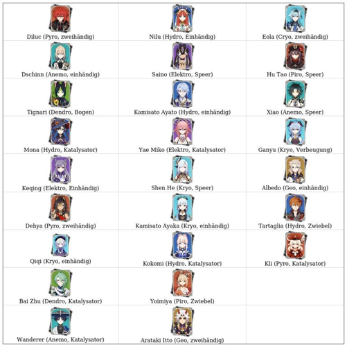 Insgesamt sind 25 Charaktere auf der Liste: 7 Standard-Helden und 18 Event-Charaktere. Mit zukünftigen Updates ist zu erwarten, dass diese Auswahl erweitert wird, wobei die Erweiterungen vor allem Helden betreffen, die schon länger im Spiel sind und nun über das Chronikgebet wieder verfügbar gemacht werden.