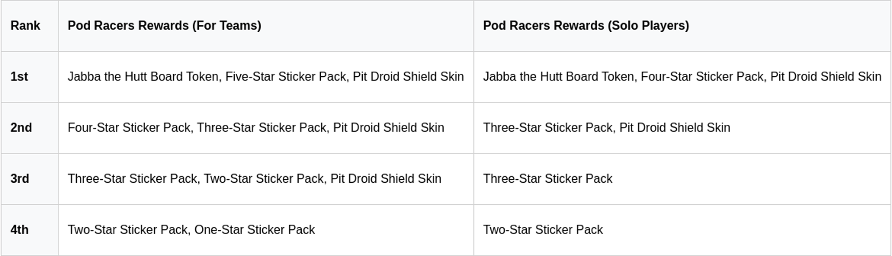 Pod Racers primarily functions as a team-based challenge, though players have the option to compete solo. Solo participation yields modest rewards compared to team efforts. Collaborating with teammates unlocks the chance to earn the grand prizes: a purple sticker pack, the Jabba the Hutt token, and a Pit Droid shield skin. Solo racers receive a four-star pack instead, but the token and shield skin rewards remain consistent regardless of playstyle.