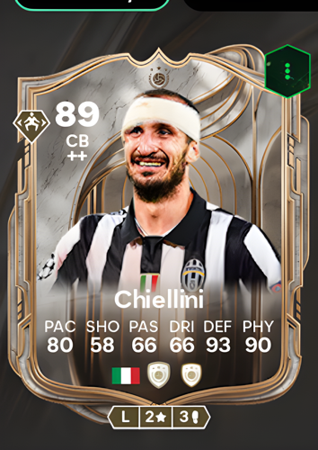 Giorgio Chiellini’s Icon card stands out as a commanding Center Back with an impressive overall rating of 89, featuring remarkable defensive (93) and physicality (90) attributes. While his pace (80) ensures he can keep up with swift attackers, his passing (66) and dribbling (66) provide reliability when building play from the back. Although not renowned for shooting (58), Chiellini’s strengths lie in his ability to anchor your defense, intercept dangerous plays, and dominate aerial duels. This card is ideal for players seeking a resilient and tactically astute defender who can fortify their back line and neutralize even the most formidable opponents.