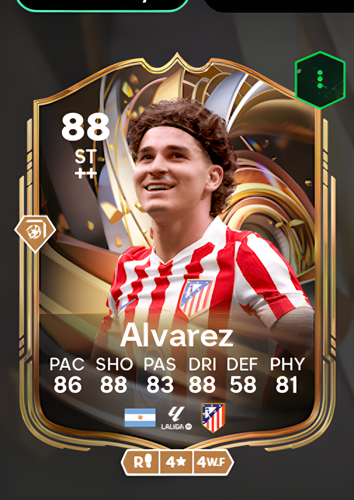 Julián Alvarez’s Ratings Reload card stands out as an exceptional Striker, boasting an impressive overall rating of 88. With remarkable attributes such as 86 pace, 88 shooting, 83 passing, and 88 dribbling, Alvarez is equipped to lead the attack with speed and precision. His physicality rating of 81 ensures he can hold his own against tough defenders, while his 58 defense rating reflects his focus on offensive prowess. As a striker, this card offers the advantage of sharp attacking capabilities, allowing you to swiftly break through opposing defenses and capitalize on scoring opportunities to secure victory in crucial moments.