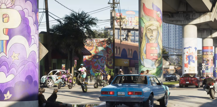 The game's Florida-inspired Leonida map, centered on neon-drenched Vice City, provides the perfect playground. Long coastal highways invite high-speed straight-line battles, while tight urban streets and rural backroads offer technical corners and risky shortcuts. Trailer footage showcases a vibrant car culture: customized lowriders bouncing at meets, dirt bikes popping wheelies amid graffiti-covered underpasses, and sleek sports cars tearing through palm-lined avenues. A top-down view in the first trailer hints at organized street race gatherings, echoing GTA V's car meets but amplified with next-gen detail.